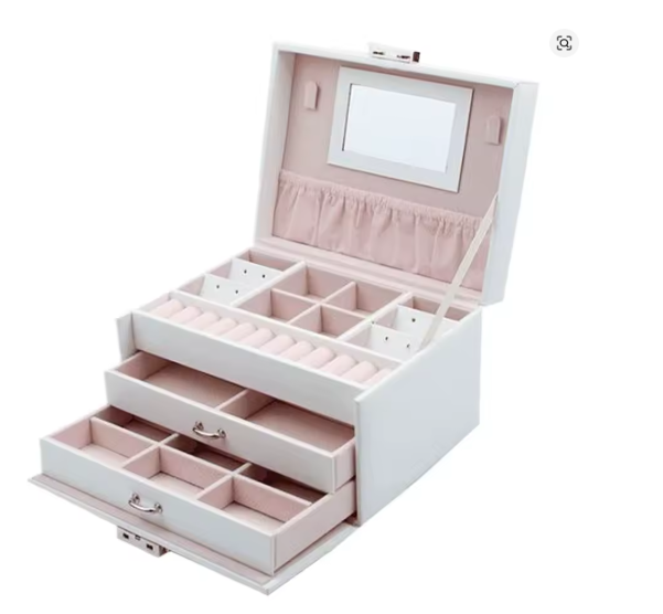 - Rangements : 2 tiroirs, 2 crochets pour colliers, emplacement pour boucles d'oreilles, espaces vides pour bracelets et petits bijoux, emplacements pour bagues, compartiments pour accessoires volumineux