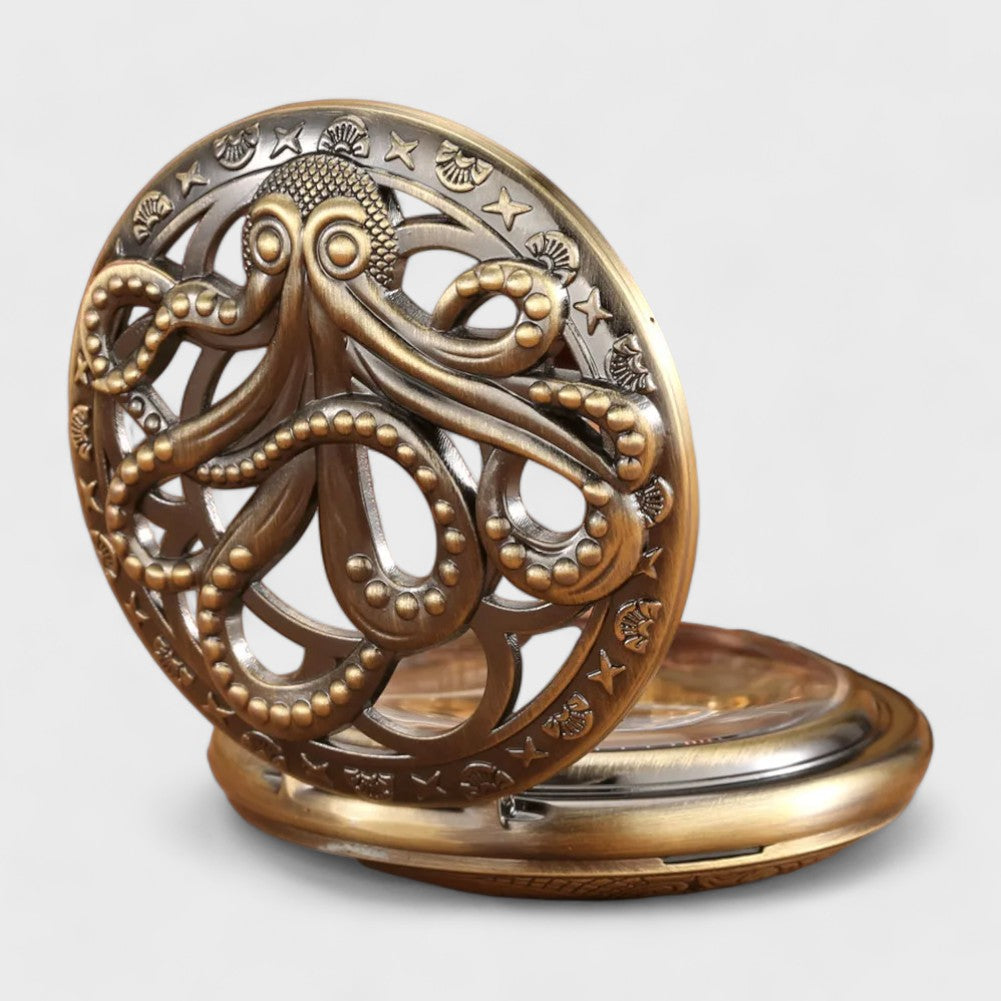 Plongez dans l’univers des profondeurs avec la montre à gousset Thalassa, un garde-temps qui allie raffinement et symbolisme marin. Son majestueux motif de pieuvre incarne la puissance et le mystère de l’océan, tandis que ses chiffres romains confèrent un charme intemporel. Conçue en acier inoxydable 316 L, cette montre de poche est résistante à la rouille et conserve son éclat au fil des années. Plus qu’un simple accessoire, Thalassa est une véritable ode au mystère maritime et à l’élégance vintage.